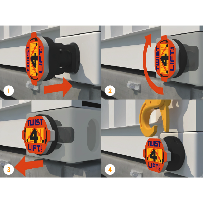 Twist4Lift est un système de crochets de levage conçu pour les conteneurs maritimes équipés de coins conformes à la norme ISO 1161.